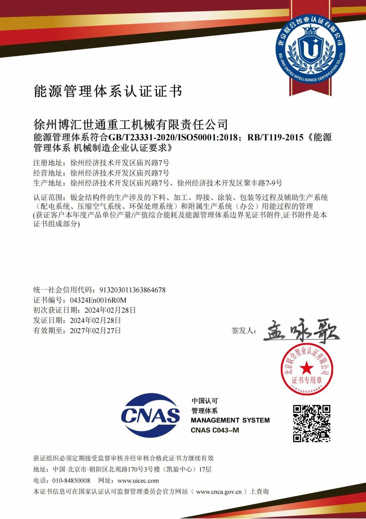 1月31日至2月5日,博匯世通順利完成了北京聯(lián)合智業(yè)認證有限公司的能源管理體系初次認證,并于2月28日獲得能源管理體系認證證書。